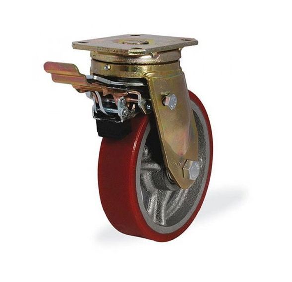 Колесо большегрузное поворотное KAMA 250 мм чугунное/полиуретан с тормозом в Тамбове